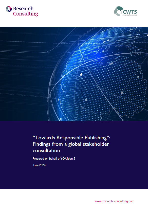 This project presents the findings of a global multi-stakeholder consultation conducted between November 2023 and May 2024 on behalf of cOAlition S. The consultation was led by a partnership between Research Consulting and Leiden University's Centre for Science and Technology Studies (CWTS), with input and advice from Stephen Pinfield (University of Sheffield Information School), Joy Owango (Founding Director, Training Centre in Communication) and Lin Zhang (Professor of Information Management, Wuhan University).