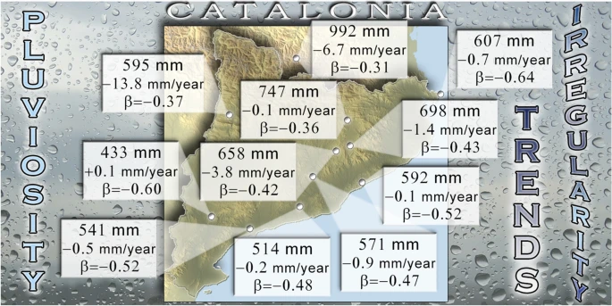 The pluviometric regime in the Western Mediterranean and concretely in Catalonia (NE Spain) is characterised by irregular amounts at monthly and annual scales, sometimes with copious short episodes causing floods and, conversely, sometimeswith long dry spells exceeding 1 month length, depending on the chosen threshold level to define the dry episode. Taking advantage of a dense network of rain gauges, most of them with records length of 50–60 years and some others exceeding 85 years, the evolution of these monthly and annual amounts is quantified by means of their time trends, statistical significance and several irregularity parameters. In agreement with the evolution of the CO₂ emissions into the atmosphere and the increasing concentration, in parts per million (ppm), of this greenhouse gas, different time trends at annual scale have been detected up to approximately years 1960–1970 in comparison with the interval 1960–1970 to nowadays.